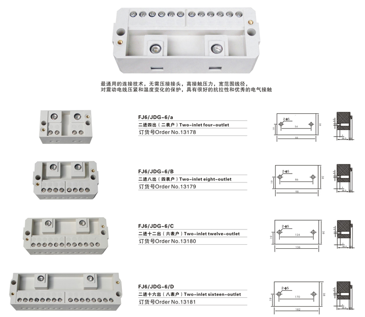 一、产品概述 General FJ6/JDG-6系列自升式计量箱接线盒,符合安全防护、美观、接线方便、安装稳固等要求。使用于额定电压660V,频率50Hz或60Hz,进线端连接导线的Zui大截面为4-50(70)mm2,出线端连接导线为0.75-16mm2。本产品采用自升螺钉压线夹直接压接方式。在压线夹与螺钉之间形成自锁,在震动条件下也不会松动脱落,在长时间的使用过程中给您带来免维护的方便。