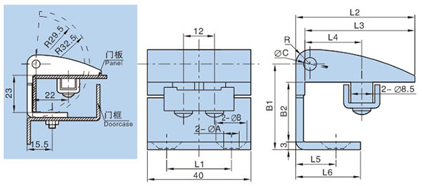 ● 材质:锌合金静铰链,镀锌钢动铰链和安装板,分不锈钢和镀镍钢销子