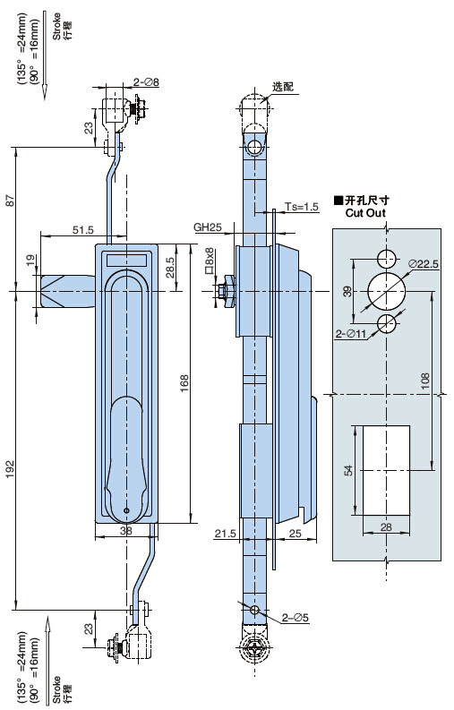 ● 表面处理:镀亮铬锁芯、齿轮盒,镀蓝白锌拉杆