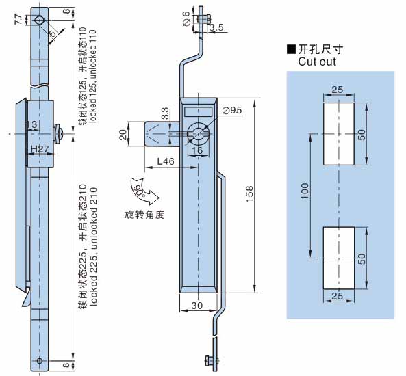● 材质: PA66锁体,锌合金齿轮盒,镀锌锁片、镀镍传动条