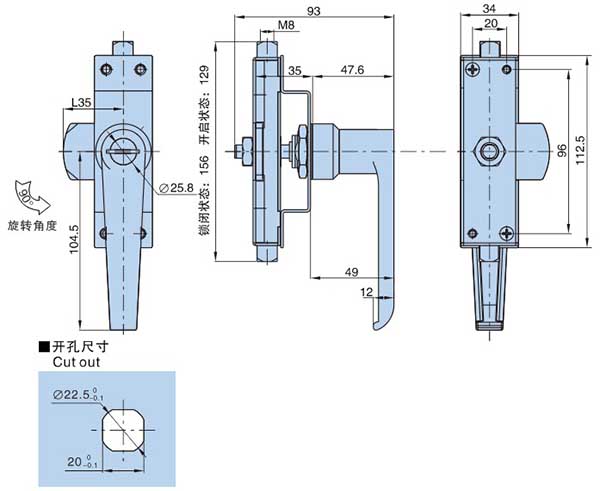 ● 材质:锌合金手柄、锁座、拉杆套,镀锌钢拉杆盒、锁片