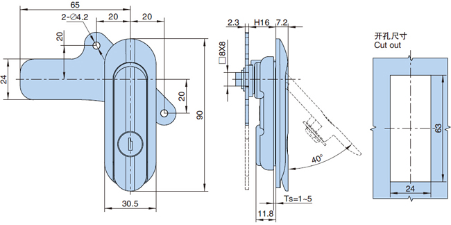 ● 结构功能:手柄向上打开,带动锁片90°旋转实现开启。