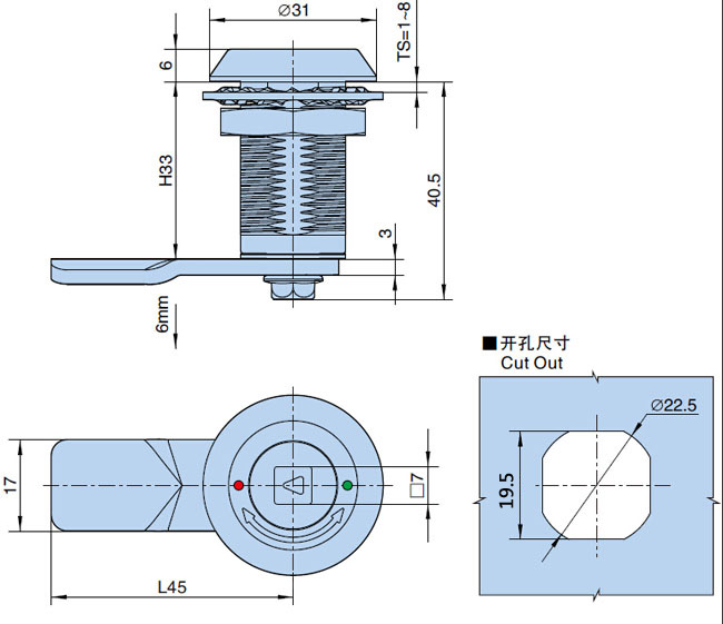● 结构功能:压缩式门锁,压缩量约为6mm,