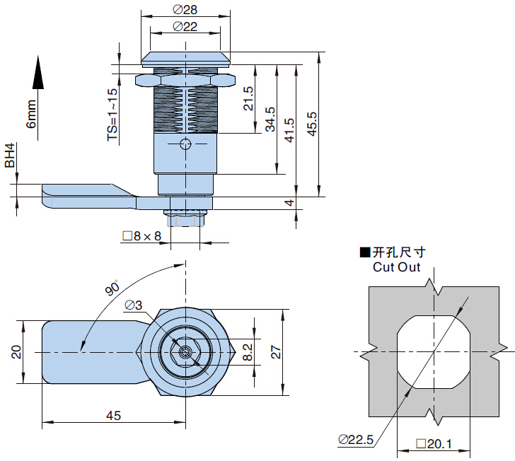 ● 结构功能:压缩式门锁,压缩量约为6MM