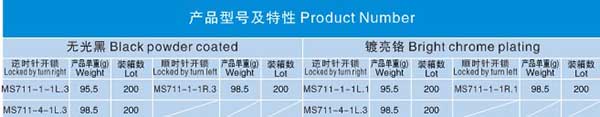● 材质:锌合金锁体,钥匙,PA-6手柄镀锌钢止动垫圈、锁片
