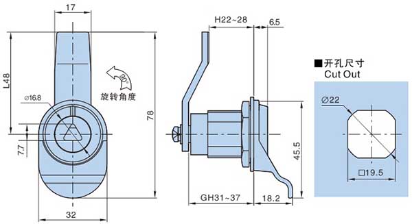 ● 备注:此锁为压缩式门锁压缩量为6mm锁芯旋转180°,MS711-4-1L为四方锁芯