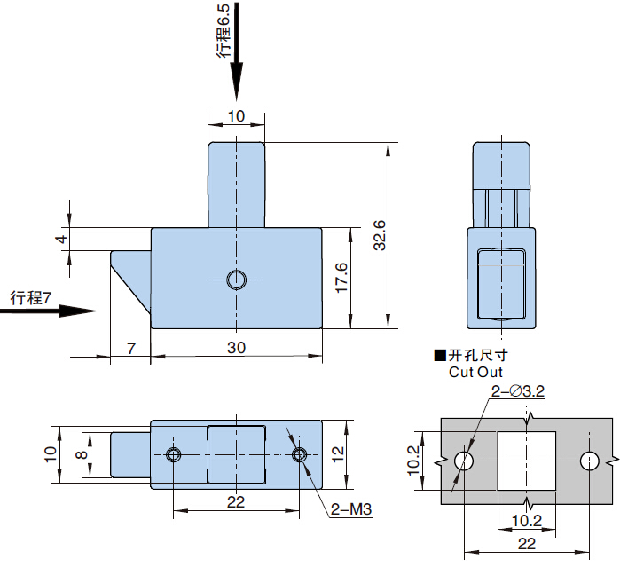 ● 结构功能:当按钮按下行程6.5mm时,锁舌往里缩7mm
