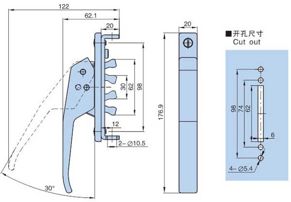 ● 结构功能:拉手并可实现拉杆锁门,行程16mm,左右开门通用