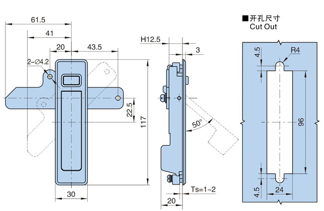 ● 结构功能:按下按钮,手柄弹出45°,实现开启或锁闭功能。