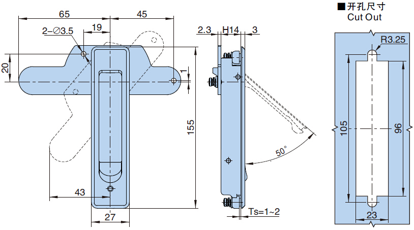 ● 结构功能:按下按钮,手柄弹出45°,实现开启或锁闭功能。