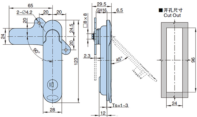 ● 结构功能:手柄向上打开,带动锁片90~旋转实现开启。