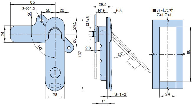 ● 结构功能:手柄向上打开,带动锁片90°旋转实现开启.