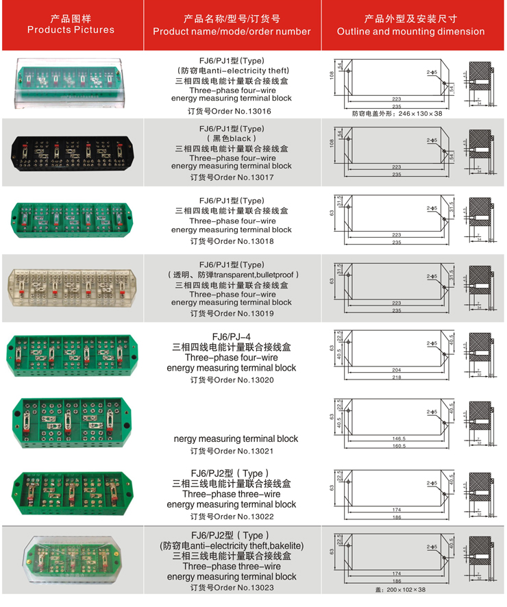FJ6/PJ1、2型电能计量联合接线盒产品为国内首创,质量优良,由于采用了美国进口的高分子聚碳酸酯(PC)材料注制而成,色泽鲜艳,外型美观,它具有抗冲击强度高,不易破裂;抗潮湿,绝缘性能好;抗老化、阻燃、耐高温;可在-40℃至+120℃范围内长期工作;接线螺钉采用复合槽组合工艺,一字十字二中螺丝刀通用。其电压回路采用一进三出,各相电压、电流具有相序标志,即方便联合接线,又可避免因相序接错而造成的计量错误,接线盒的盖板用两只可封闭的螺丝固定,有利于防窃电工作。