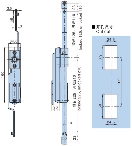 ● 材质:PA66锁体,铜转轴,或镀锌钢转轴、锁片、镀镍传动条