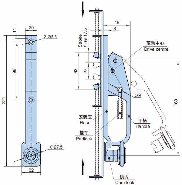 ● 结构说明:手柄带动拔杆两点联