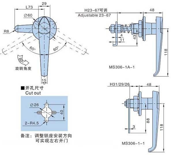 ● 备注:逆时针转90°型号为MS306-1A-1R和MS306-1-1R