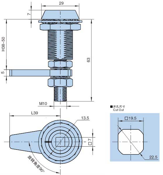 ● 备注:压缩式门锁,压缩量约为5mm,锁芯旋转180°开锁。
