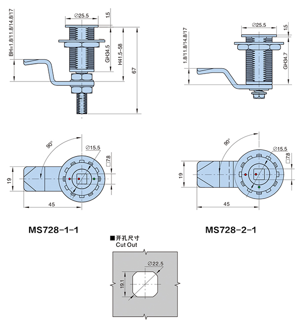 ● 备注:MS728-1-1为压缩式门锁伸缩量为7mm,锁芯旋转180°