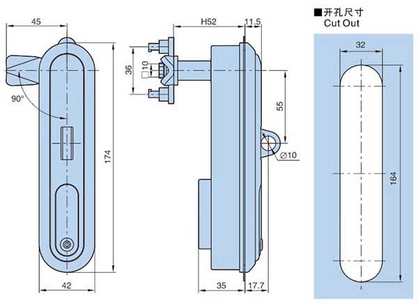 ● 备注:锁背旋转90°实现打开及锁闭调换定位件方向实现左右开启,带挂锁。