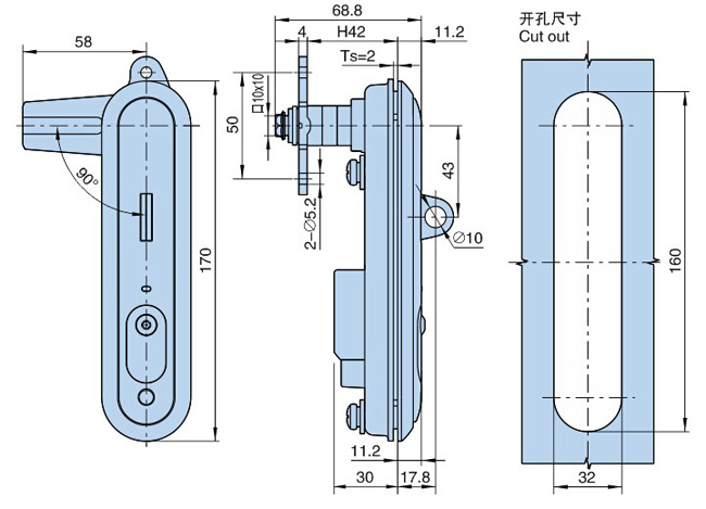 ● ● 结构说明:手柄90°度旋转,单向锁定行程18mm,三点锁定,在锁体结构不变的情况下,可以通过调换定件方向来调节左右开门,更换电子锁芯来实现电子锁与机械锁的互换;