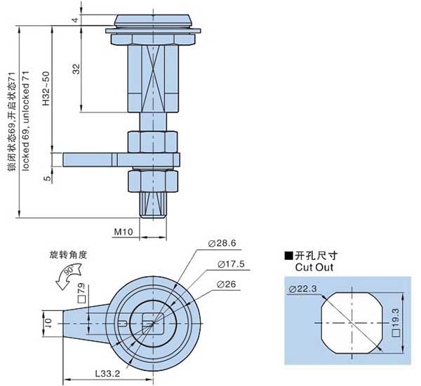 ● 材质:锌合金锁体,镀锌钢止动垫圈、锁片